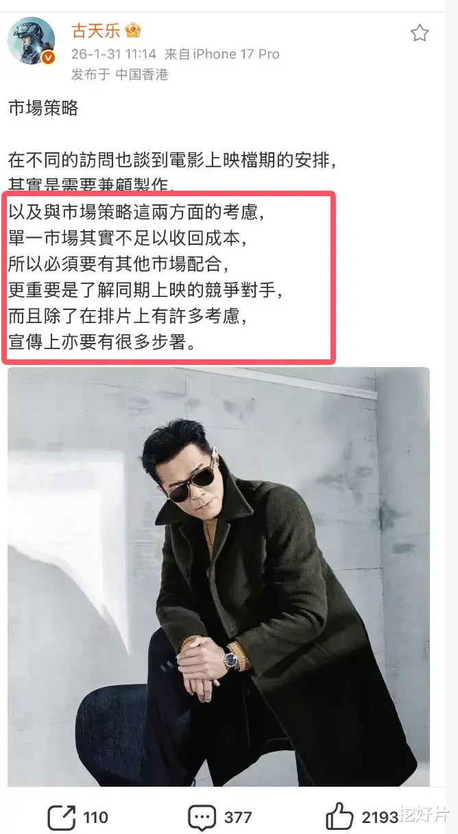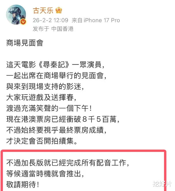 但古天乐还有大招,他说了电影的续集是否做,要根据票房来定,而电影的加长版配音部分都做完了。