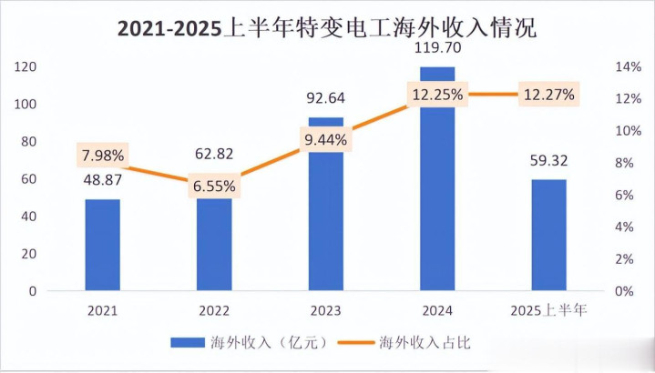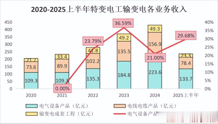 近年来,特变电工的输变电业务收入与订单均实现了稳健增长。以2025年上半年为例,公司输变电业务整体实现收入235.39亿元。在这一业务板块中,电气设备尤其是变压器产品收入增长较快。2025年上半年,电气设备产品实现收入133.7亿元,占到公司整体收入的30%左右,同比增长29.68%。这一增速远高于电线电缆和输变电成套工程,充分显示了变压器产品在特变电工业务中的重要地位以及其强劲的增长势头。